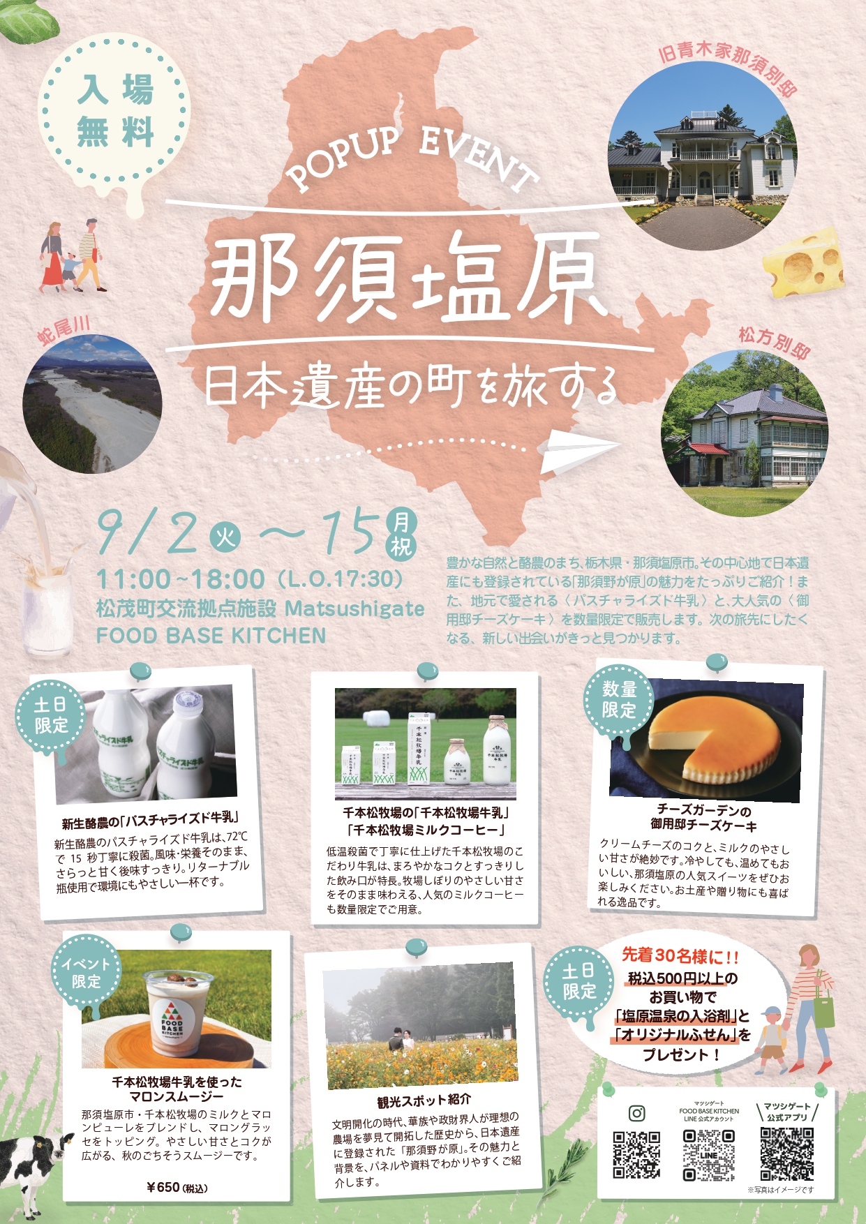 FOOD BASE KITCHEN (フードベースキッチン) では9/2(水)〜9/15(月・祝)の日程で「那須塩原市ポップアップイベント~日本遺産の町を旅する~」を開催いたします。
