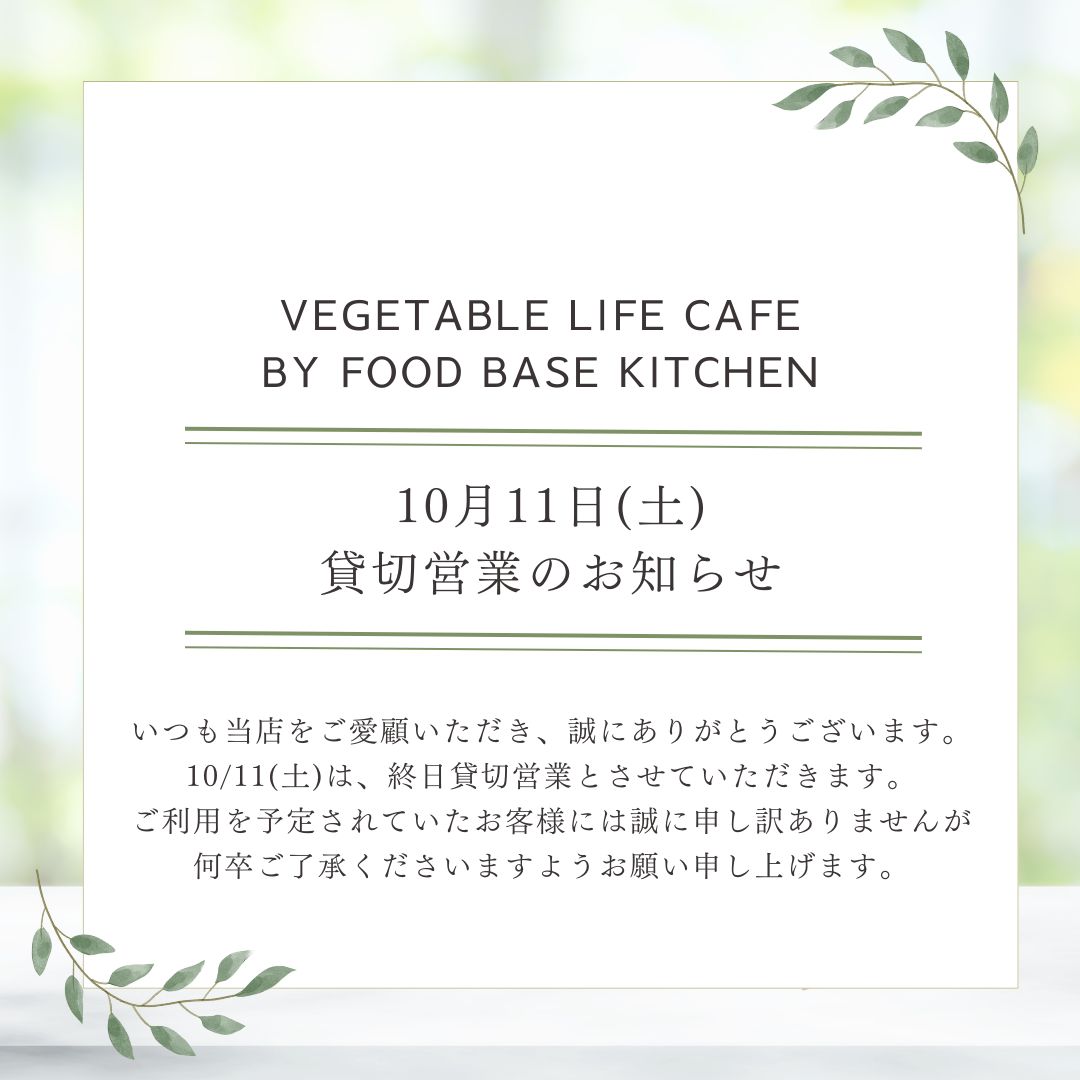 10/11(土)貸切営業のお知らせ【VEGETABLE LIFE CAFE by FOOD BASE KITCHEN】