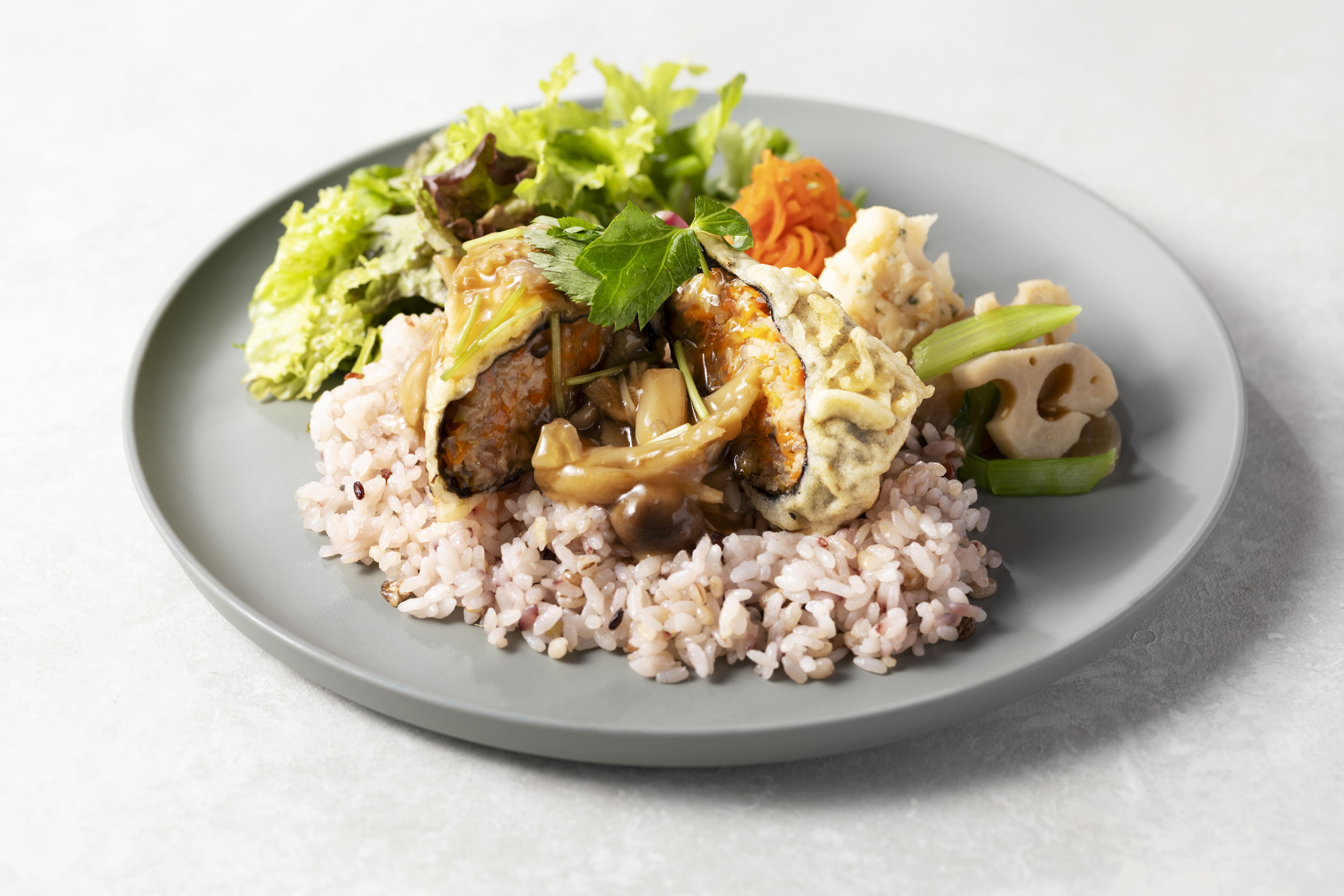 VEGETABLE:瀬戸内の海苔で巻いた春雨の天ぷら きのこ餡
