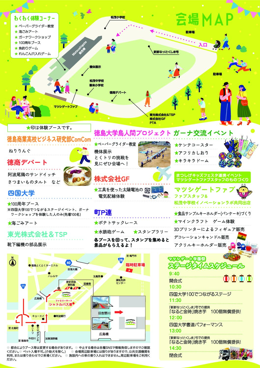 松茂町内の幼・小・中の子ども達が主役となり、創り上げてゆく子ども達参加型のワークショップイベントです。応援参加として、徳島商業高校の徳商デパート、徳島大学鳥人間プロジェクト、四国大学他、企業も集います。鳴門金時焼き芋の無償配布も行ないます。(①11:30~、②13:00~)
