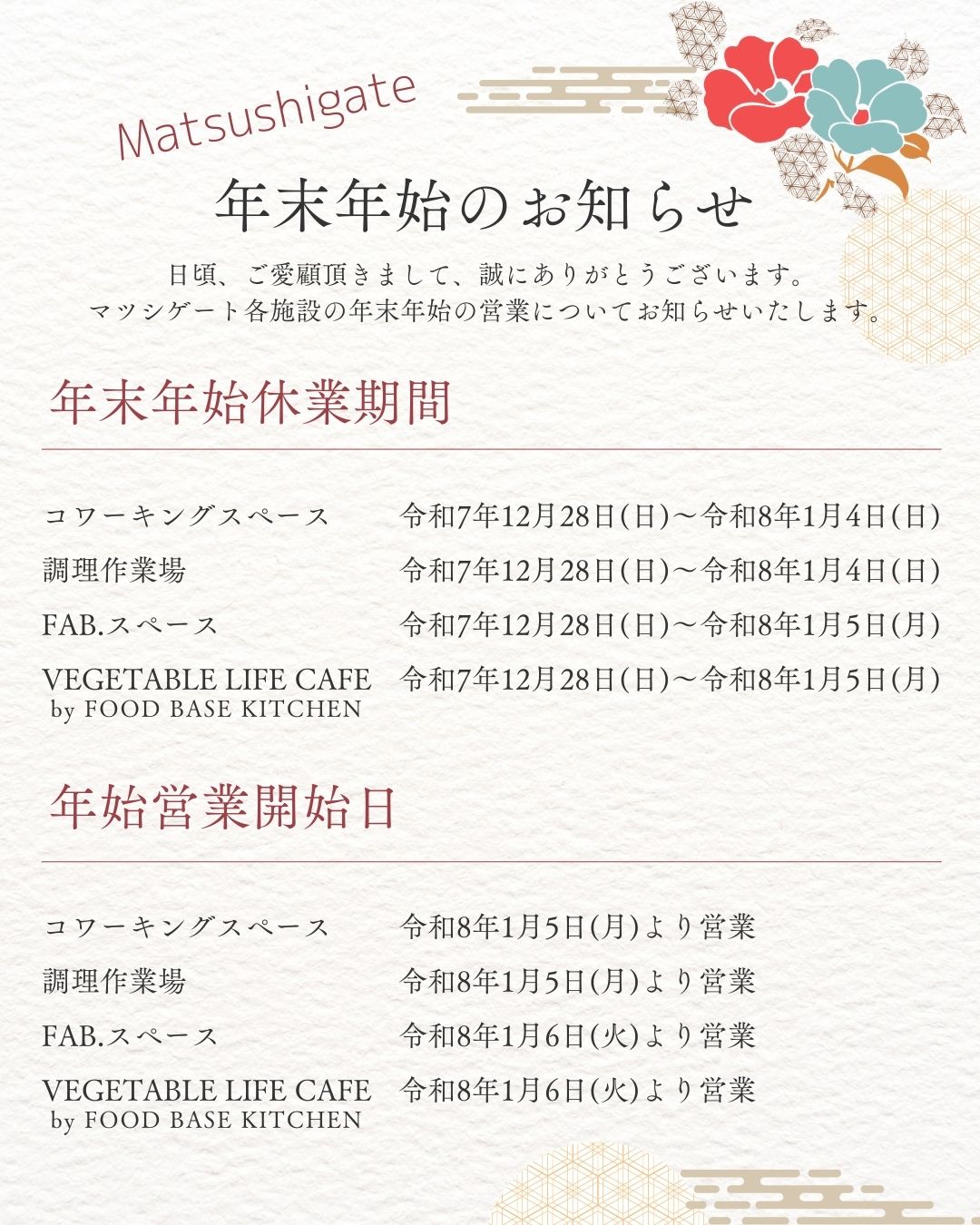 年末年始の休業日についてお知らせいたします。