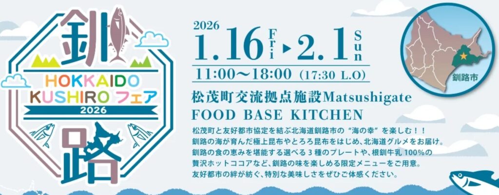 FOOD BASE KITCHEN (フードベースキッチン) では1月16日(金)-2月1(日)の日程で「北海道釧路市フェア」を開催いたします。