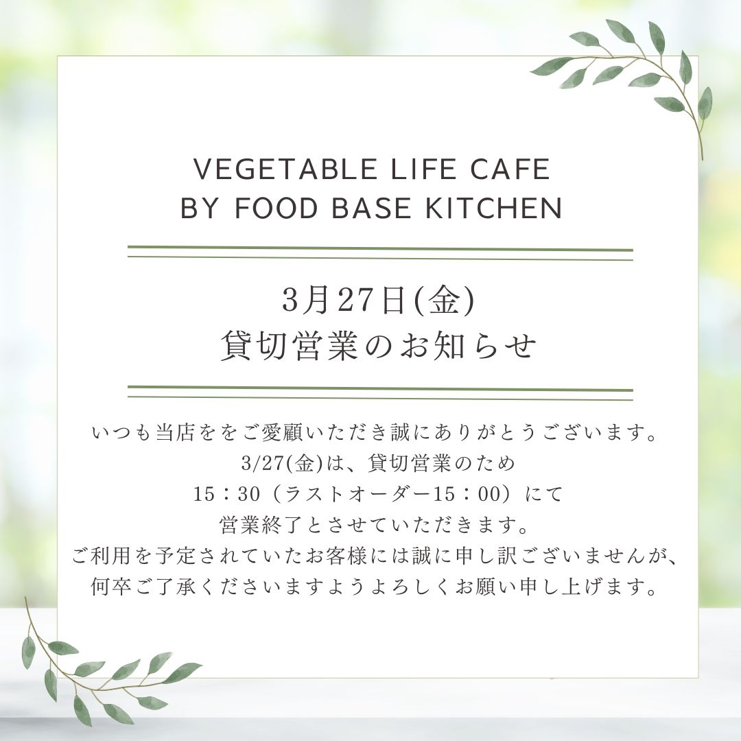 貸し切り営業のお知らせ【VEGETABLE LIFE by FOOD BASE KITCHEN】