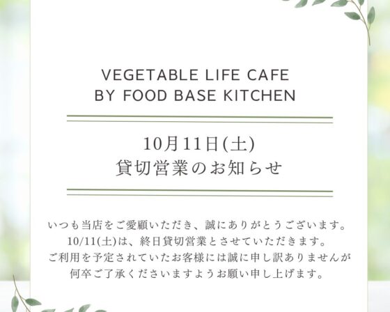 10/11(土)貸切営業のお知らせ【VEGETABLE LIFE CAFE by FOOD BASE KITCHEN】